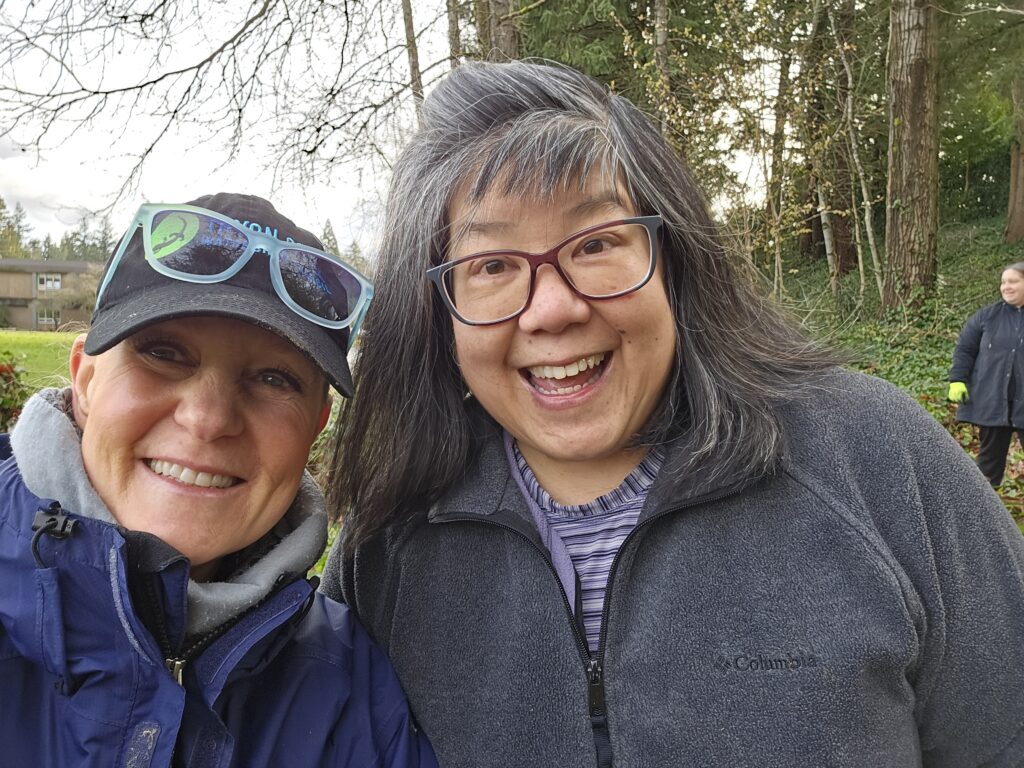 Marshall Park [above], with Monica of Portland Parks & Recreation. The slope on the east side of the main stem of Tryon Creek has been stewarded for several years, with volunteers at No Ivy Day and Watershed Wide working slowly upstream along the riparian area to remove English ivy and holly. This Watershed Wide, 21 volunteers followed up that work by installing 400 native plants and freed one tree of ivy.