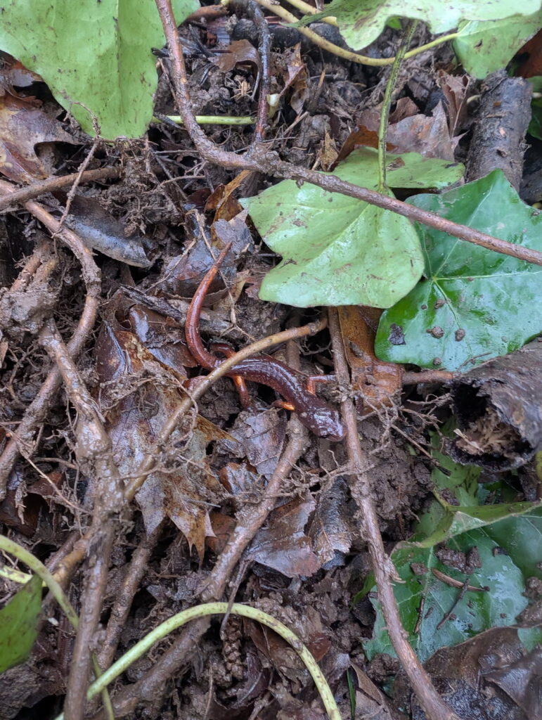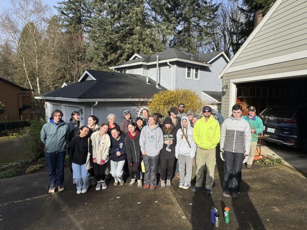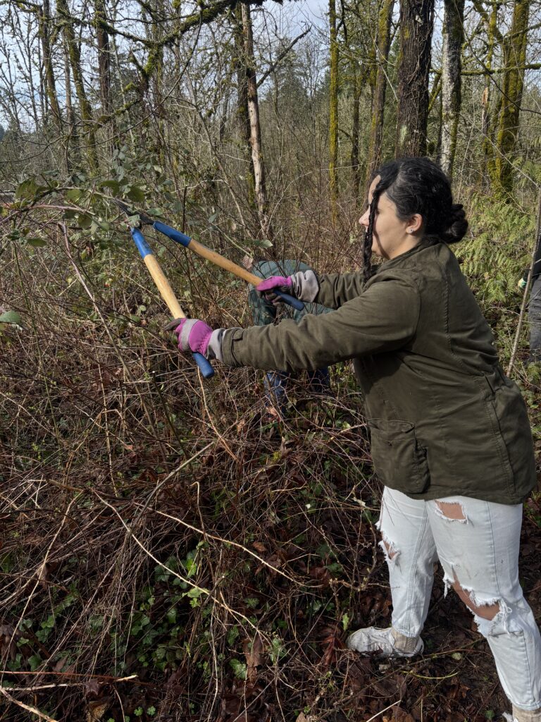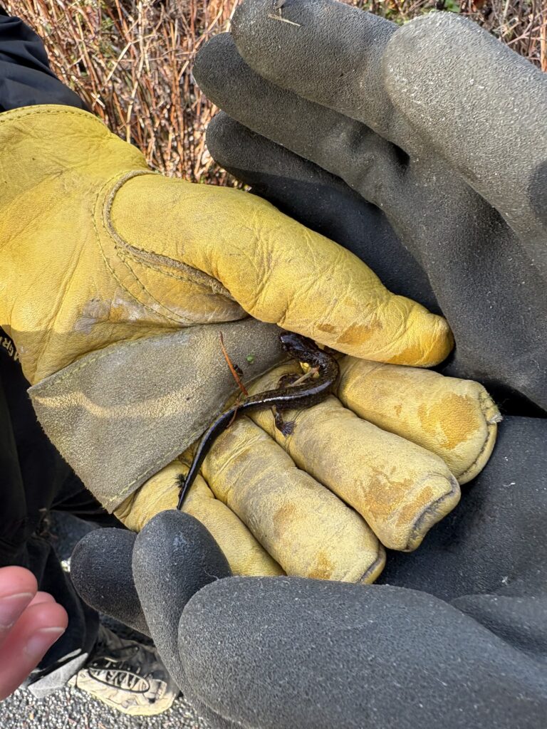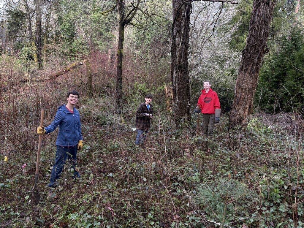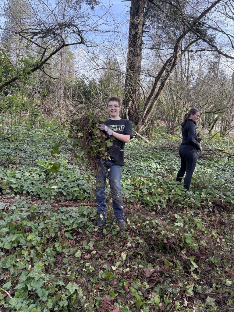 Boonesferry Terrace Homeowners Association [above]. These longtime stewards led a Riverdale student-heavy site alongside TCWC Board member Megan, W3 Development Manager Ruth, and Riverdale’s National Honors Society student leader Stella. 25 youth volunteers and 9 adult volunteers worked across 1.6 acres to remove invasively growing plants and freed 10 trees and shrubs of ivy. Riverdale students found a salamander while clearing at this site!