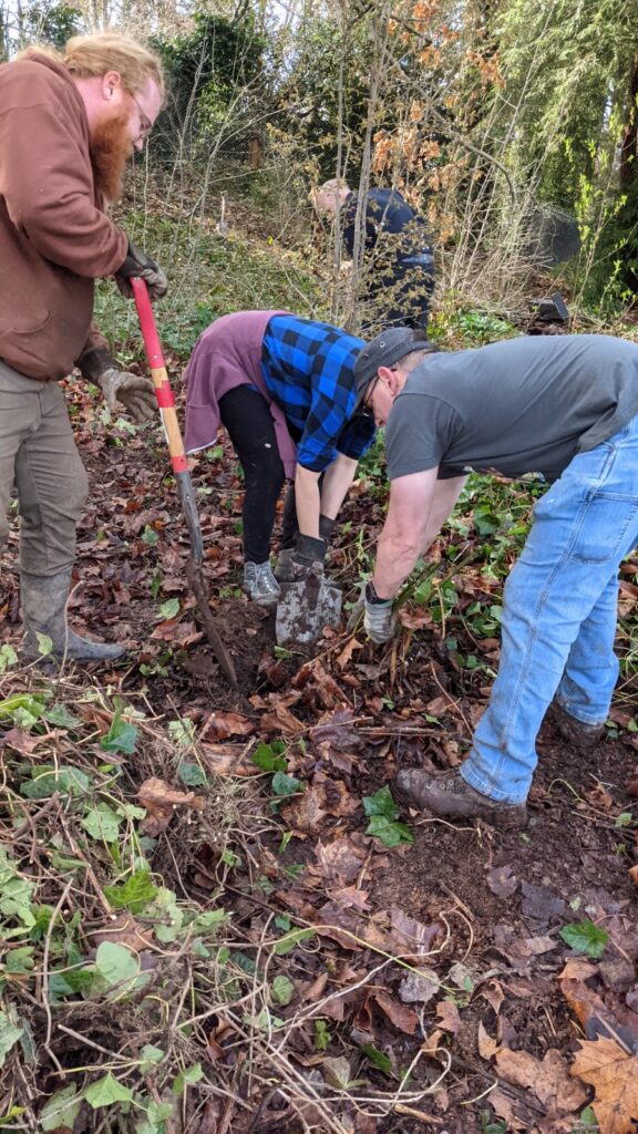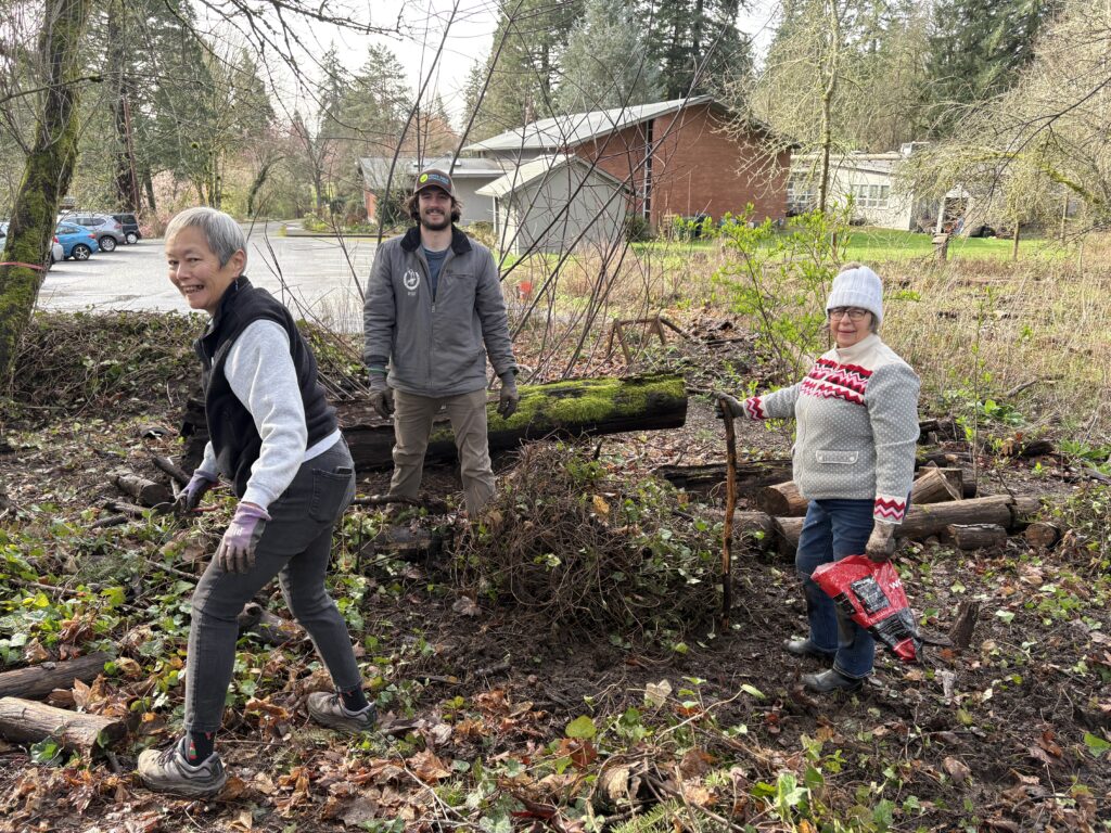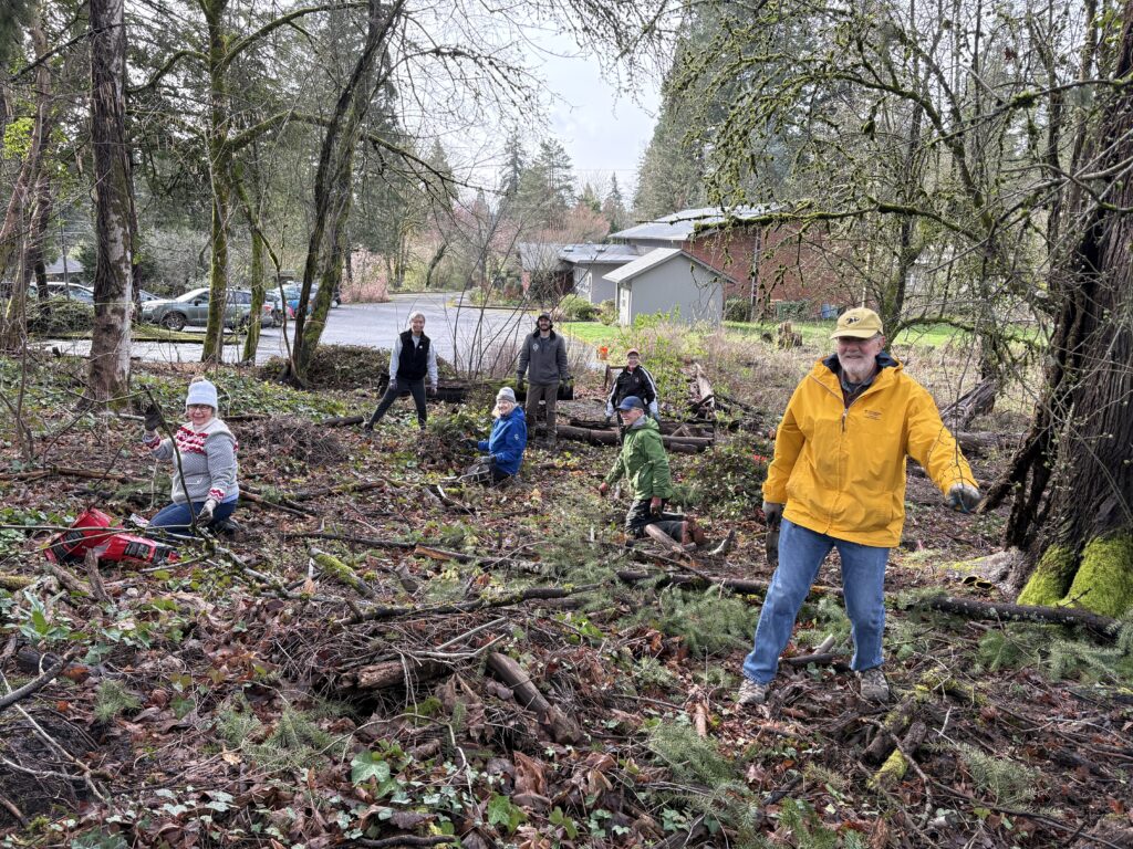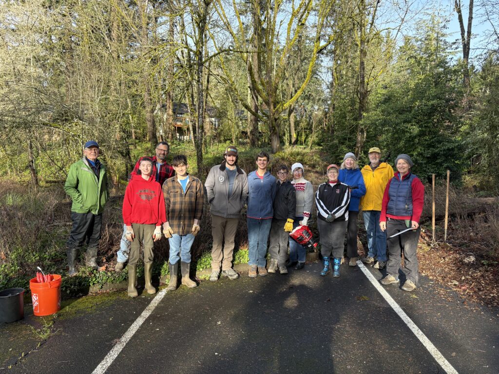 Lake Oswego United Church of Christ [above], in partnership with their active Earth Justice team led by Kathy of LOUCC and TCWC Board member Will. A total volunteer crew of 18 folks converged alongside Spirit Creek, a tributary to Nettle Creek, to remove 2500 square feet of English ivy throughout the work area – including from 24 shrubs and trees.