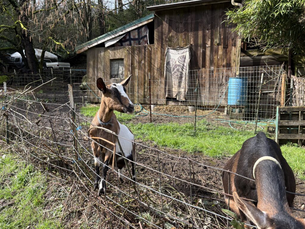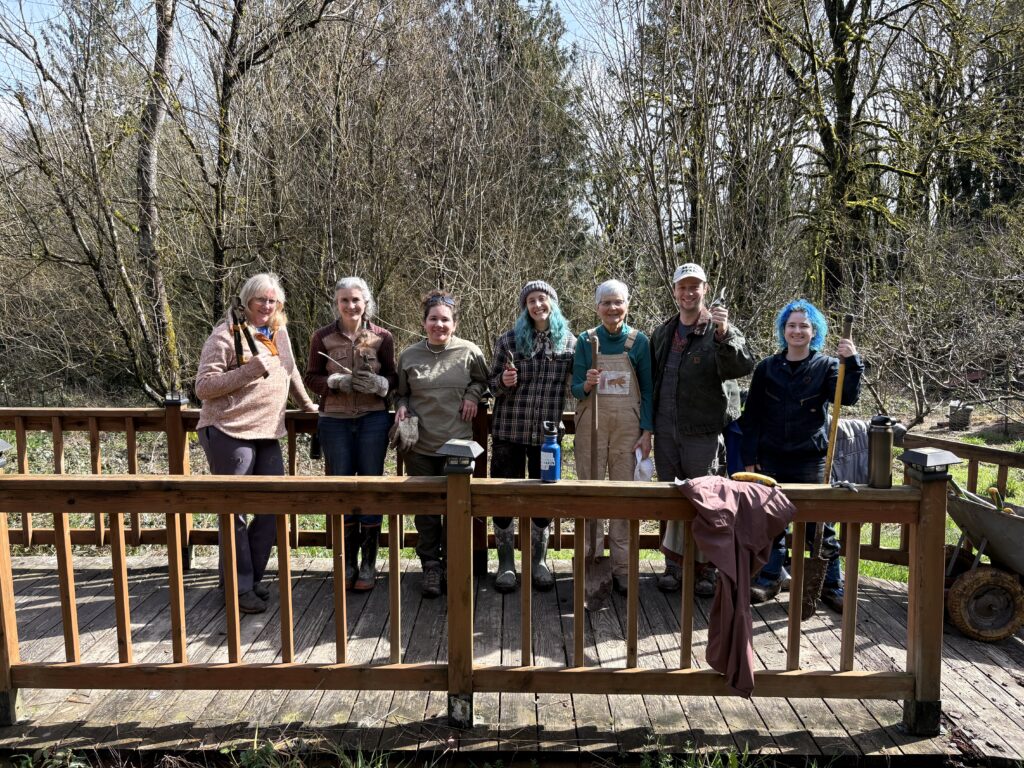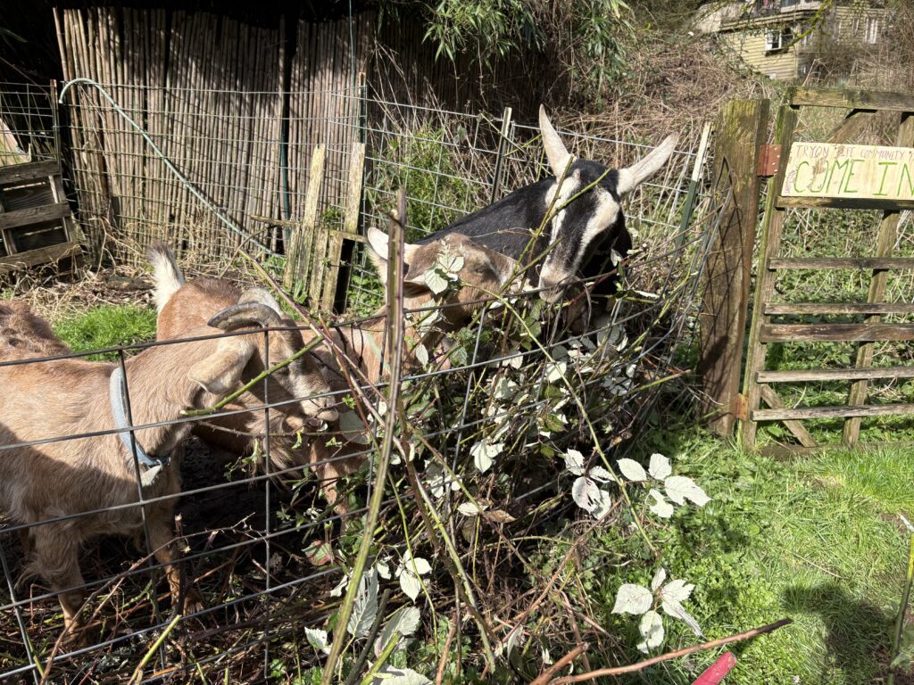 Tryon Life Community Farm site [above], led by Arwen, Hindi, and TCWC Board member Dusty. The group was cheered on by resident goats as 9 volunteers cut and dug out Armenian/Himalayan blackberry roots, clearing 420 square feet of invasively growing blackberry and freeing one tree of ivy.