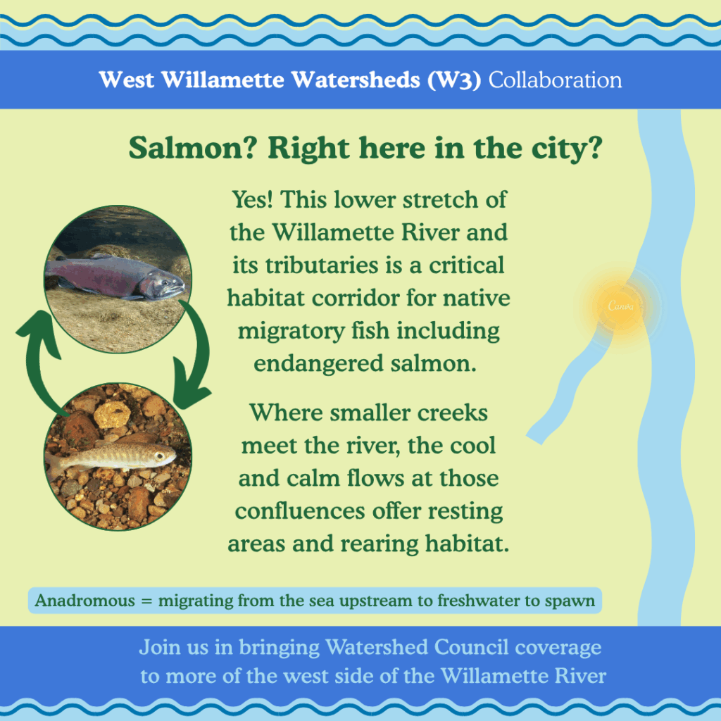 When salmon migrate from their freshwater streams, out to the Pacific Ocean, and then back to their natal streams to spawn, they need cool, calm water at confluences with the Willamette River. Regardless of whether they migrate over a hundreds miles further upriver to spawn in reaches like the McKenzie River near Eugene, or are nearby in the Clackamas or Tualatin Rivers, the Willamette River provides critical habitat especially at confluence junctions.